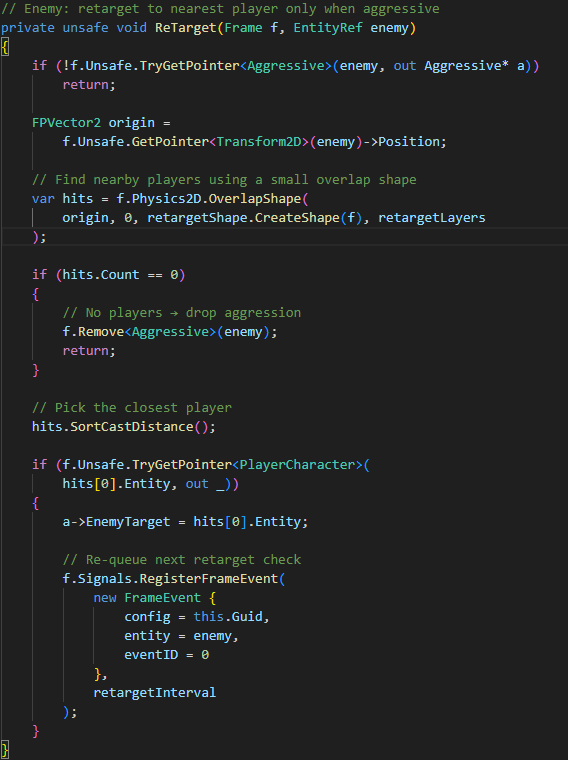 The fix was to invert the process: instead of every enemy searching for the player, the player searches for nearby enemies. Once an enemy is found within a player’s detection radius, the enemy is assigned an Aggressive component, which immediately hands control over to the enemy’s state and pathing logic. From that point on, the enemy no longer performs heavy detection queries—it simply reacts and pathfinds toward its assigned target. This player-driven approach reduced the number of physics queries from “potentially hundreds per frame” down to a predictable “once per player per interval,” eliminating lag while maintaining identical gameplay behavior.