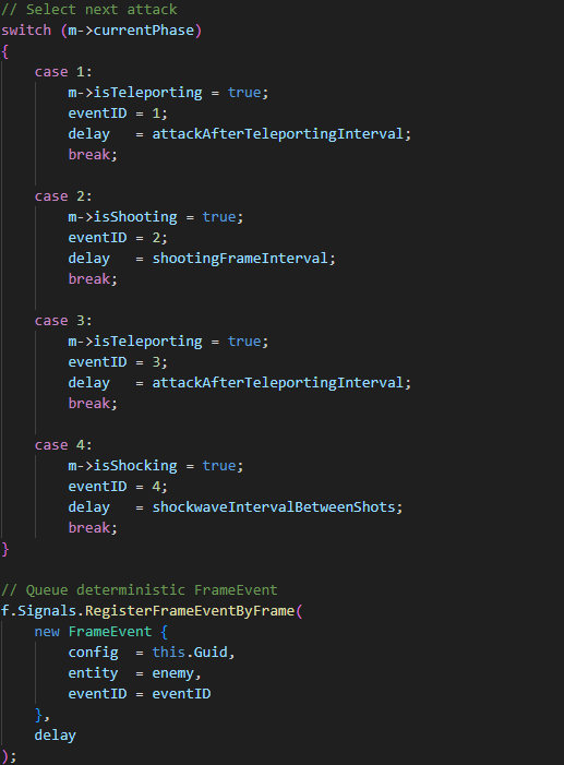 I created a contained function that gathers all relevant state from the miniboss, its health, its phase, and its internal counters, then resolves the next action in one pass. This function ensures that only one FrameEvent is ever queued per decision cycle, and that the event is correctly associated with the miniboss's state machine. By consolidating the logic, I was able to enforce strict ordering, preserve deterministic behavior across clients, and make the boss’s attack loop maintainable and fully predictable. The final system not only fixed the desync issues, but also allowed me to implement more advanced phase behavior, looping attack sequences, and clean transitions between abilities—all controlled through a single, reliable decision-making function.