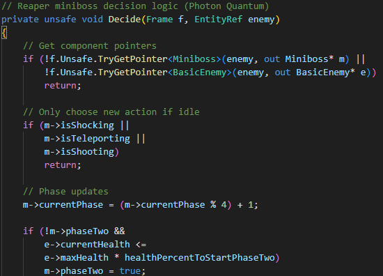 While working on the Reaper miniboss AI in Photon Quantum, I discovered a recurring issue where multiple abilities were being scheduled as separate FrameEvents, but Quantum’s deterministic frame queue would occasionally execute them out of order. Because each attack—teleport, shoot, and shockwave—was triggered from different parts of the codebase, the miniboss could end up with overlapping states or back-to-back actions that ignored intended cooldowns. This resulted in desynced client simulations, unpredictable attack patterns, and cases where the miniboss entered conflicting animation states. To solve this, I decided the entire attack-selection process needed to be centralized into a single, deterministic decision step.